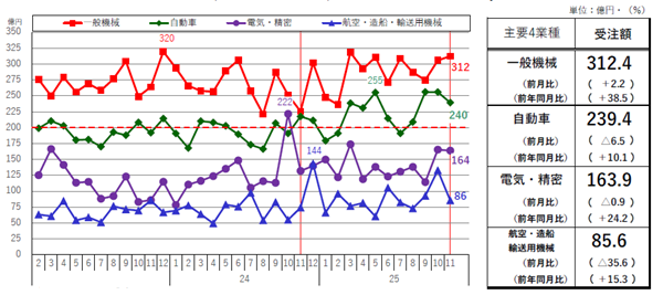 日本工作機械工業会がこのほどまとめた2025年11月分の受注実績は以下の通り。