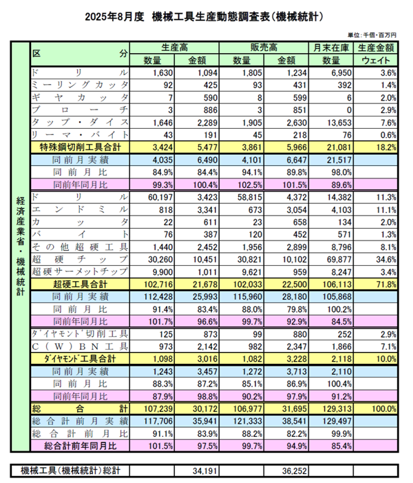 経済産業省の2025年8月度 機械工具生産動態調査(機械統計)は以下のとおり。