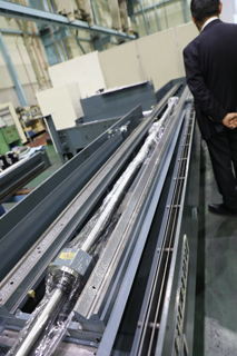 同社では、ユーザーニーズに沿って機械を作り込んでいくのだが、今回の見学会では、「APC(自動パレット交換装置)が不要。」という要望に応えた機械を作っていた。「他メーカーではAPCが付いているものは外すことができず、対応できない。」と断られ、相談に来られたので対応したという。ちなみにこのマシンは、航空機産業向けだと聞いた。