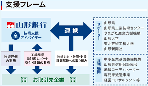 山形銀行では、2015年から「ものづくり技術力向上支援プログラム」を実施し、山形県内企業を中心に経営面と技術面の双方から多角的な支援を行っている。本取り組みを可能としているのは、山形県工業技術センター出身で異なる専門分野を有する5名を技術支援アドバイザーとして招聘へいして、県内の大学や同センターなど外部機関との協力関係を構築し、強固な支援体制を整備した点にある。加えて、同行独自の取り組みとして、支援企業に対し、財務内容と技術力の両面から事業性を評価のうえマトリクス化し、支援項目の優先順位を明確化する手法を導入している。支援効果は、定期的に財務内容と技術力の再分析を行い、マトリクスを更新することで確認され、銀行内で共有される。このことにより、支援先企業に対して必要に応じたさらなる技術力向上の提案を可能とし、優れた成果を実際に生み出している。また、その過程で設備導入による投資促進を通じて、県内GDPの向上や雇用確保にも寄与している点を高く評価した。