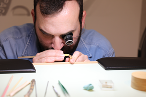 特に印象的だったのは、極めて細かな部品の仕上げ加工に特殊な木が用いられていた点だ。面取り仕上げの最終工程で使われていたのは〝ジャンシャン〟というスイスに自生する木で、高度1000メートル以上の地域でしか採取できないという。この木は秋から冬にかけて木が乾燥した時期に採取され、その後、数週間から数ヶ月にわたりアトリエでさらに乾燥させ、十分に水分を抜いた後、中央部を切り出して〝磨き用工具〟として用いるのだ。パジェス氏はその理由について、「周囲は非常に硬く、内部は柔らかいという木の特性があり、磨き作業に非常に適している」と説明してくれた。素材の性質を知り尽くし、選び抜かれた道具からも時計師ならではの緻密なモノをつくる工程がうかがえた。