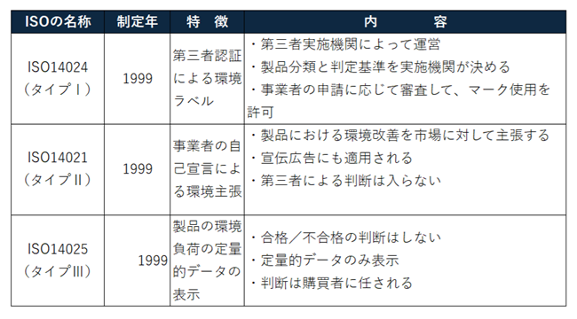 国際標準化機構(ISO:International Organization for Standardization)では1993年に環境マネジメント分野の規格制定を目的として、207技術委員会(TC 207:Technical Committee 207)が組織された。TC 207が所管するISO規格群には14000番台の番号が付与されており、その中でも、「環境ラベルおよび宣言(Environmental labels and declarations)」シリーズには14020番台が割り当てられている。JTAが制定した「TAS14021」の規格番号もこの分類体系に由来している。参考としてISOの標準化で採用されている環境ラベルの種類と性格を表1に示す。なお、JTAは制度運営において独自の評価体制を有しているが、資金面および構成要員の独立性の観点から、ISOに基づく「第三者」には該当しない。