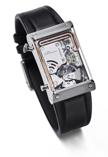 大塚ローテックは、時計界のアカデミー賞と呼ばれているジュネーブ・ウォッチメイキング・グランプリ2024のチャレンジ部門(3000スイスフラン以下の時計部門)でグランプリを受賞した現代の名工である片山次朗氏の国産時計ブランドで、今回発表した「9号」片山氏がモジュールだけでなくベースムーブメントから手掛けた自社製ムーブメントを搭載した腕時計。アワーストラインキング、トゥールビヨンなどの複雑機構を、縦44ミリ、横30ミリのスクエアケースに収めている。
