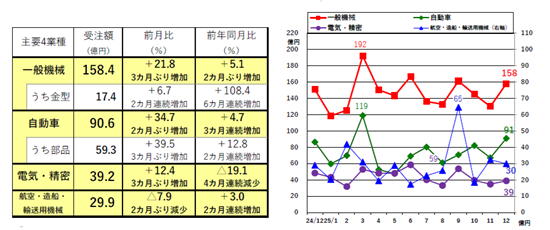 業種別にみると、全11業種中7業種が前年比で減少した。主要4業種の前年比は、「航空機・造船・輸送用機械」(同+45.8%、353億円)が5年連続で増加した一方、「一般機械」(同▲2.9%、1,759億円)、「自動車」(同▲4.3%、871億円)、「電気・精密」(同▲4.0%、525億円)は、ともに3年連続で減少し、コロナ禍から回復した2021年以降では最も低い受注額となった。主要4業種以外では「官公需・学校」(35億円、同+38.8%)が大きく増加した。