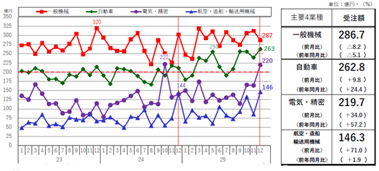 12月の工作機械受注は内外需ともに前月比はプラスとなった。特に外需の伸びが寄与し、堅調に推移。受注の先行きは、社会情勢が目まぐるしく変化する中、概して設備投資は堅調な動きとなり、続く2026年の需要増に期待。