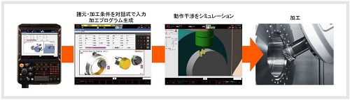 また、CNC装置マザトロールSmoothXに搭載された対話式プログラミング機能では、歯車加工プログラムの作成に必要な専門知識(歯車諸元の複雑な計算)やCAD/CAMソフトが不要。図面に記されている諸元や、送り速度などの条件をグラフィカルなガイダンスを見ながら設定するだけで簡単かつ短時間で加工プログラムを作成できる。歯車の機内計測機能についても同様で、計測結果に基づく補正追加工やバリ取り加工が段取り替え無しで可能である。