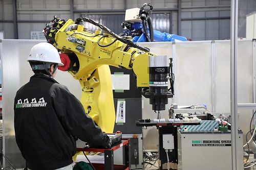 今回は、ファナックM-800iC/60によるドリミル加工実演、ファナックR-2000iC/190Fによる面削穴あけ実演、安川電機MOTOMAN-GG250(市販予定機種)によるFSW加工実演、初披露となる安川電機MOTOMAN-GP25による研磨加工実演などが行われた。