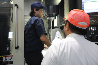 5軸制御立形マシニングセンタ『D500』は、一例だが、有名なドリンクびんの金型を製造するためにも活躍していた。ちなみに『D500』は相模原工場に導入してから5年が経つ。生産性の向上から3年前に大阪工場、今年は秋田工場にも導入している。金型の写真はNGだが、綺麗な微細模様もついている。機密性が高いため、詳細を省くが、鋳物をドライ加工で行っているという。ちなみに一部分の加工だが、R0.3 mmの工具で1万2,000回転。それを聞いた宮崎社長が能率を高めるためのヒントを担当者に話をしたあと、「なにかお困り事はありますか。」と尋ね、担当者は〝切りくず処理〟について相談していた。