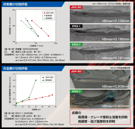 (2)SS材、SC材、SCM材など35HRC未満の被削材の不安定加工や高能率加工に適しており、湿式加工にも対応する。