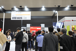 アマダグループで来場者が見入っていたのは、「HRB-8025 + CR-010B」。コスト、設置スペース、プログラム作成など、自動化導入における課題に応える協働ロボット付きベンディングマシン。加工内容や人員の状況に応じ、単体モードとロボットモードをフレキシブルに切り替えることができ、効率的な生産を実現。しかも安全柵が不要で省スペース。オペレータ1人で多台持ちが実現する時代に合致したマシンに人だかりが出来ていた。