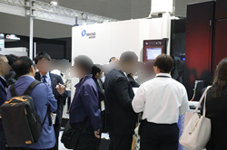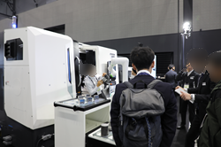 大勢の来場者が押し寄せていた牧野フライス製作所。写真撮影もひと苦労なほどだった。その中でも特に注目されていたのは、5軸制御横形マシニングセンタ「a500iR」だ。このマシンの特長は、同社が高速・高品位加工を実現するために独自開発したNC制御技術であるスーパーGI技術をさらに進化させたスーパーGI.6 I制御。ワークと干渉しない範囲で工具の姿勢が制御されるので、工具の動きの安定化により高品位な加工ができるものだが、従来よりも選択可能なモードが増えていた。
