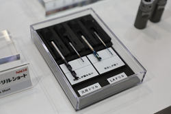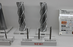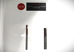 銅の加工は熱電率が高く、粘っこい切りくずが出るため、切りくずの排出性が悪く加工泣かせだが日進工具が展示していたのは新製品の「銅電極加工用ニック付き3枚刃スクエアエンドミル「DHS340・DHS340F」。この製品は強ねじれ・特殊ニック形を採用し、主軸やワーク保持剛性に依存せず工具剛性と切れ味のバランスを最適化している。切削負荷を抑制した銅電極の荒取り加工を実現する高精度な微細加工を行うためにあるような一品。