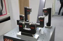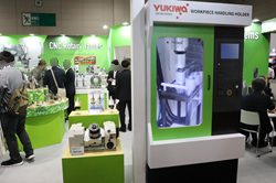 チャックとNC円テーブルに高い評価を博しているユキワ精工。今回のMECTでは趣向を凝らしたブース展開をしており、マシニングの模型からロボットの代わりにワークを自動交換する様子を映像で流していたこと。模型の横にはツールホルダでワークを自動交換できる「ワークハンドリングホルダ」とワークの自動割り出しによる位置決めができるCNC傾斜円テーブル「TNT100L」が展示されており、自動化に貢献する同社の製品群をPRしていた。