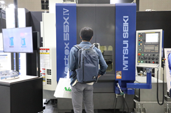 ユーザーから根強い人気を誇っている三井精機工業の「VERTEX 55X」が新たにバージョンⅣとして登場! ヘッドとテーブルの熱変位対策がさらに強化されたうえ、クーラントタンクはメンテナンス性能もアップしていた。2m×3mの設置スペースで最大φ750mm×高さ525mmのワークが積載可能。自社製の傾斜・回転テーブルを採用しており、〝他社とは異なる付加価値〟を提供していることが分かる展示内容だった。