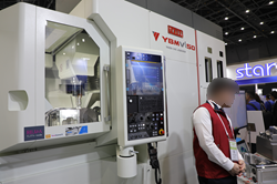 加工現場からの支持が厚い安田工業。今回はEVや航空機産業、半導体部品といった現代ニーズに応えたマシンを展示。なかでも「YBM Vi50」は、金型・部品形状や大型化に応えるハイエンド5軸マシニングセンタ だが、注目したいのは傾斜範囲の全域において高精度を実現する支援ソフトだ。同社独自の補正機能「T-COM」でワーク重量を自動推定し、モーメント・傾きが大きくなっても機械精度が維持できるようにアシストしてくれる。今回は半導体部品のサンプルとしてシール面の磨きレス加工を展示していた。