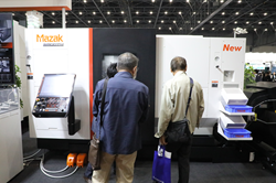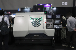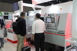 毎度来場者を楽しませてくれる華やかなヤマザキマザック。今回も見どころが満載だったがなかでも工程集約・自動化の観点からデジタル活用を強く推進していたことだ。人が生活で使うモノのほとんどが小さく精密な回転部品や軸部品が使われているため、現在、小径バー材量産加工ニーズが増しているが、このニーズに応えるべく展示していたマシン、小型2タレットCNC旋盤「QRX-50MSY SG」に注目したい。このマシンは2タレット/2スピンドル構造と自動化により素材の搬入から製品の搬出までの工程を1台に集約でき、生産性を高める豊富な自動化オプションを用意していた。