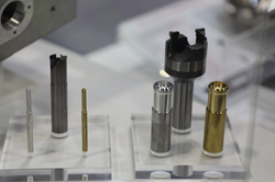オーエスジーのブースではグループ会社であるノダプレシジョンとのコラボ製品、〝工程集約と高精度加工を両立する総型カッタ〟が展示されていた。写真左が「オニクワカッタ」で高能率にピンの仕上げ加工ができるもので、中空構造で多様な長さのピンに対応する。写真右がアンダーカット形状に対応する工具仕様の「バルジカッタ」でその名の通りバルジ形状を切削工具で対応するもの。