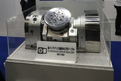 現在、製造現場には自動化が求められているが、北川鉄工所は、機械運転時間を増やすとともにメンテナンスや設備費用を減らすことのできるグラインディングセンタ仕様の「NC円テーブル」を展示していた。注目点は、炭化ケイ素とアルミナを混濁させたスラリー内で100万サイクルの耐久試験をクリアしたものであるということ。研磨加工、ガラス加工、セラミック加工など粉塵が出てくる過酷な状況でも耐える強靱設計を存分にアピールしていた。