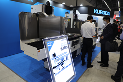 企業が環境負荷を減らすことは社会全体への貢献になるうえ、省エネ設備の導入はコスト削減にもつながるが、黒田精工が展示していた環境対応型モデルの精密ロータリー研削盤「GSR-600」は、環境性・操作性を両立させ、高精度加工を実現するマシン。キモは独自設計の油動圧ロータリーテーブルで、高い合成と水源性を発揮、φ630のテービルは上面の振れ精度と回転精度が高いので安定した高精度加工を行える。