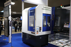 阿部寛さんのTVCMで話題の芝浦機械。注目したのは本年5月に市場投入した5軸制御の超精密マシニングセンタ「UVM-450D(5AH)」だ。特長は、新たに開発した自社製HSK方式エアスピンドルを標準搭載し、従来の回転精度を維持したまま汎用性を高めたこと。注目は、PCD工具を使用した仕上げ工程では加工ワークを傾斜させることで工具周速ゼロ点を回避することが可能となり高品位な加工面を実現すること。