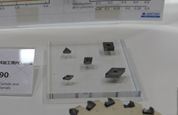 PCD工具は非常に硬いうえ耐摩耗性があるので高精度・高効率な切削が求められる分野で重宝されている。住友電気工業で拝見したのは、高密度・粒子間結合力強化により優れた耐摩耗性、耐欠損性を発揮する超硬合金・硬脆材・アルミ複合材料加工用PCD工具「スミダイヤ DA1090」。チッピング、摩耗を抑制し、従来のものと比べ耐摩耗性が1.6倍も向上しているという新製品。