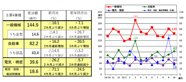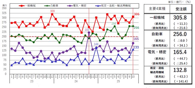 2025年10月分工作機械受注総額は、8カ月連続の1,200億円超。1400億円超えは7カ月ぶり。前年同月比では4カ月連続増加。