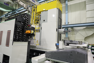 続いては、工具が240本を活用できるATC(自動工具交換装置)付きの機械を拝見。「240本も工具を使うユーザーってどんな会社ですか?」と尋ねたところ、「秘密です。」とのこと。工具をたくさん使うので複雑な加工に対応するための機械を発注したのだろうと想像する筆者。この機械の特殊な点は、基本的には4軸だが、2枚パレットがあり、片方のパレットにNCのロータリーテーブルを立てて載せ、片方が5軸仕様にできている点である。この場合、通常はAPCを活用できないとのことだが、ロータリーテーブルを載せたまま、APCが実行できる特殊仕様だ。通常の4軸の横形としても使え、5軸加工もできるという便利な仕様にも対応している。