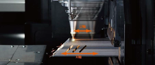 回転軸(B軸)を持つ3次元レーザヘッドにより、φ254mmまでのパイプ材に加え、203mmまでのH/I/L 形鋼などの加工にも対応する。3次元レーザヘッドは材料(X軸)と平行方向に移動するU 軸を有し、材料を動かすことなく多方向からの加工が可能。材料移動に伴う振動を抑え、高品位な加工を実現。さらに、X軸とU軸の同時動作による高速加工が可能。