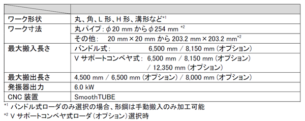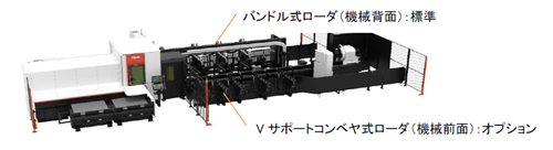 また、多品種少量生産に対応する「Vサポートコンベヤ式ローダ」(オプション)異なる形状のパイプや形鋼などの素材を最大5本ストックすることができる。長尺材にも対応し、異なる材料の自動搬入により生産性向上に寄与する。バンドル式ローダとV サポートコンベヤ式ローダは、顧客の加工や生産形態に合わせて選択でき、両方を付けることも可能。