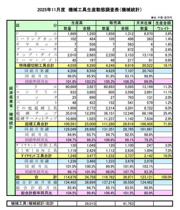 経済産業省の2025年11月度 機械工具生産動態調査(機械統計)は以下のとおり。