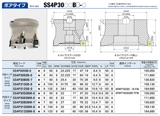 今後需要の増加が見込まれるダイカスト向け等の大物金型やモールドベース、大型部品の底面の荒~中仕上げ加工には多コーナの汎用ショルダー工具を使用されるのが一般的だが、同社は工具径Φ50以上の多コーナ汎用ショルダー工具のラインナップはなく、競争力を欠いた状況にあった一方で、主に底面加工用途として開発し2014年に発売したアルファ快削ショルダーミル4コーナ「SS4P」は経済性に優れる90°タイプのショルダー工具であるものの、発売当初よりシャンクタイプ(Φ25~Φ40)のみのラインナップであり、使用用途が限定的だった。そこで、同社は、SS4Pの適用領域拡大を目的として、同商品のボアタイプ大径サイズ(Φ50~125)をラインナップに追加した。