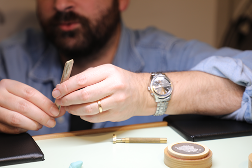 特に印象的だったのは、極めて細かな部品の仕上げ加工に特殊な木が用いられていた点だ。面取り仕上げの最終工程で使われていたのは〝ジャンシャン〟というスイスに自生する木で、高度1000メートル以上の地域でしか採取できないという。この木は秋から冬にかけて木が乾燥した時期に採取され、その後、数週間から数ヶ月にわたりアトリエでさらに乾燥させ、十分に水分を抜いた後、中央部を切り出して〝磨き用工具〟として用いるのだ。パジェス氏はその理由について、「周囲は非常に硬く、内部は柔らかいという木の特性があり、磨き作業に非常に適している」と説明してくれた。素材の性質を知り尽くし、選び抜かれた道具からも時計師ならではの緻密なモノをつくる工程がうかがえた。