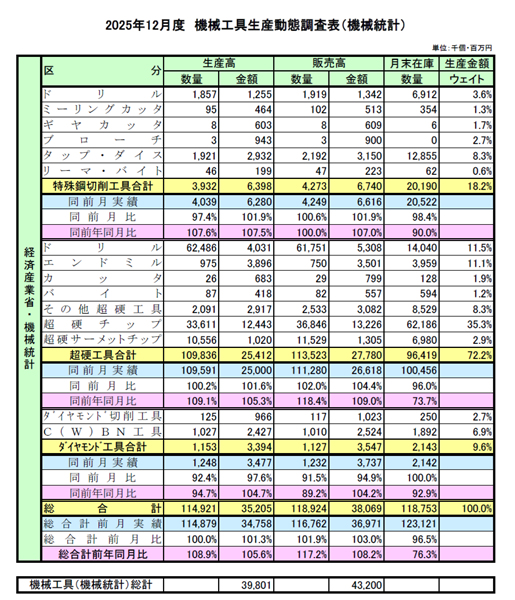 経済産業省の2025年12月度 機械工具生産動態調査(機械統計)は以下のとおり。