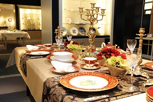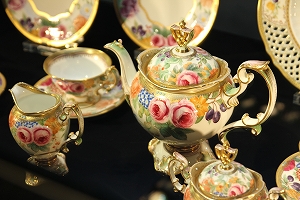 ちなみにこの写真にあるティーセットだが、素材は柔らかさが特長の“ボーンチャイナ”。ボーンチャイナとは、牛骨から精製したリン酸石灰を加味して焼かれた軟質磁器のことをいう。独特の柔らかな感触と透光性のある乳白色の優雅な生地が珍重されたが、同社では画柄の色彩効果を上げるため、旧来の常識を破り、乳白色から白色度の高いボーンチャイナの開発に成功、現在に至っている。