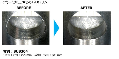 直交交差・偏心交差時のドリル入り側のバリ、抜け側のバリ(裏バリ)に対応する。最小穴径はφ2mmから対応可能。