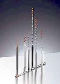 近年の自動車製品は燃費向上を目的とした軽量、小型化が進んでおり加工される穴径も小さくなっており、その一方で、穴位置や真直度といった穴精度は、エネルギー伝達ロスの低減や製品の長寿命化に伴い、公差範囲は年々狭くなっている。このような背景を受け、同社はφ1.0~φ2.0、加工穴深さはL/D=3~30まで(工具直径の30倍まで)の小径穴を高能率、高精度に加工できる超硬ドリル「超硬OH(オイルホール)ミニステップボーラー」を開発した。この商品は、オイルホール付きのコーティング超硬ドリルで、高能率に深穴加工ができる。先端の刃先形状は専用に開発した「高精度刃先形状」と、コーティングは小径ドリル専用に開発した「新コーティング技術」を採用し、平滑表面を実現している。この「高精度刃先形状」と「新コーティング技術」を用いたことで、深く小さい穴径の加工を切り屑詰まりすることなく、高能率かつ高精度の穴あけ加工を可能にしている。